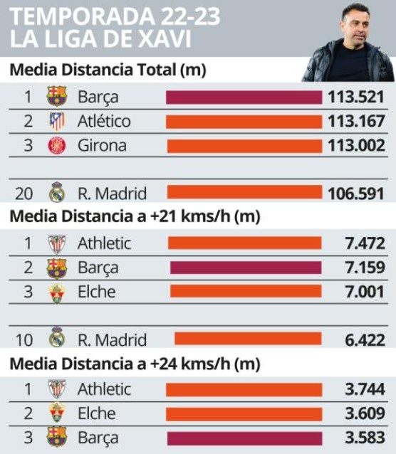 相比之下,那两年皇马的跑动距离远少于巴萨。因此,哈维和弗里克带队夺冠时的数据非常相似。问题在于,在本赛季的前八轮比赛中,有十四支西甲球队的跑动距离超过了巴萨。