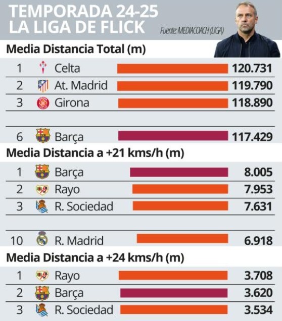 在哈维的带领下,球队通过全面掌控比赛并极少失球赢得了冠军。而在弗里克的带领下,球队则通过高强度逼抢和多点开花的进球方式夺冠。但数据显示,这两支球队在每名球员的跑动距离、冲刺次数以及中距离努力方面都名列前茅。