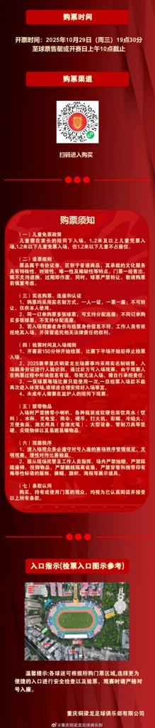 关于本次全场TIFO:请大家于比赛日当天13:30入场,听取DJ和现场工作人员指挥,做好准备并保管好用于展示的TIFO物品,使用完毕后不要随意丢弃。请尽量身着红色助威服,营造属于重庆的看台红色之海!这面TIFO,是我们共同的态度,这片红海,是我们向更高舞台翻涌而去的滚滚浪潮!